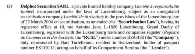 Nga një hetim më i thelluar kuptohet se Delphos Securities SARL, një shoqëri me përgjegjësi të kufizuar e inkorporuar sipas ligjeve të Luksemburgut, është një subjekt i pasiguruar i titullarizimit (société de titrisation) sipas ligjit të Luksemburgut të datës 22 mars 2004 mbi titullarizimin, e ndryshuar.