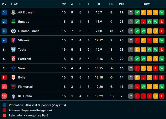 Superliga shqiptare e futbollit mbylli të hënën raundin e 15-të, me AF Elbasanin që kryeson i vetëm renditjen. Verdheblutë mposhtën 1-0 Vllazninë në 'Elbasan Arena'. Në Rrogozhinë, Egnatia fitoi 2-0 kundër Vorës duke qenë në ndjekje të kryesuesve me një pikë më pak. Ndërkohë në Vlorë, Flamurtari u mposht 0-3 nga Dinamo, me trajnerin e vendasve, Francesco Moriero, që kritikoi disa nga lojtarët e tij.