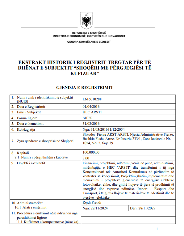 Kuotat e Shoqërisë “HEC A…I”, sh.p.k, me seli qendrore në Fierzë, Bashkia Fushë Arrëz në masën 33.30 % , të cilat i përkasin ortakut “P… GROUP” sh.p.k.