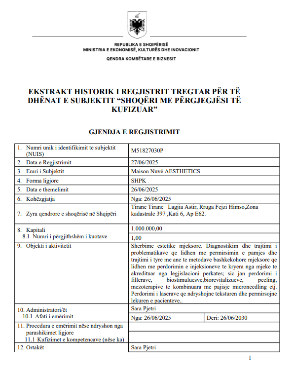 “Në klinikën tonë do të gjeni një gamë të gjerë shërbimesh estetike mjekësore, të ofruara sipas protokolleve të standardizuara dhe të bazuara në praktikat më të avancuara klinike. Çdo trajtim realizohet me precizion dhe kujdes maksimal, duke përdorur vetëm produkte të certifikuara dhe të aprovuara klinikisht. Misioni jonë është të theksojmë bukurinë natyrale, të rikthejmë vetëbesimin dhe t’u ofrojmë pacientëve standardin më të lartë të kujdesit estetik të personalizuar”, thuhet në faqen e klinikës.