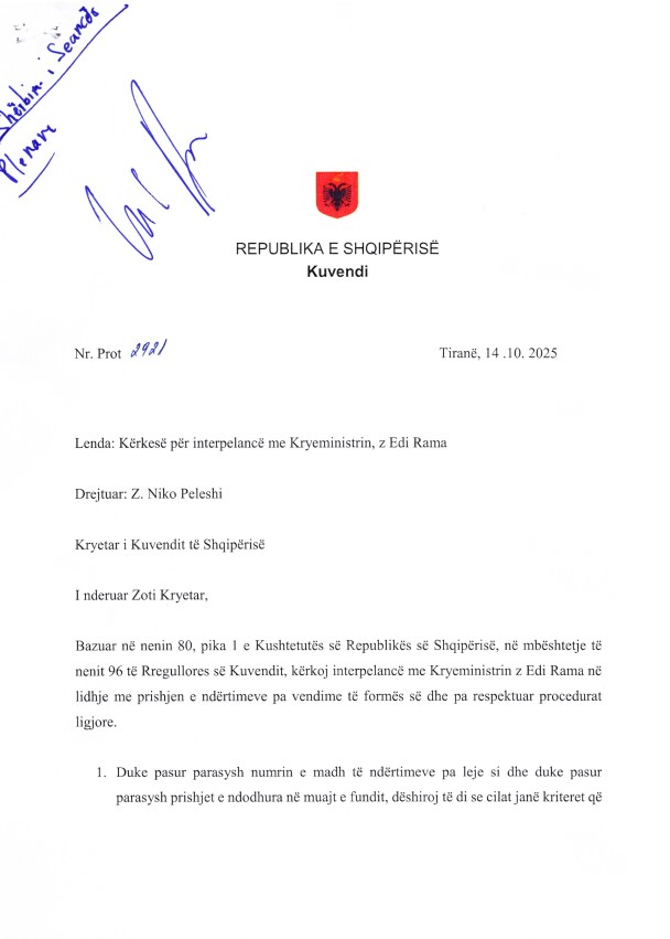 "Duke pasur parasysh numrin e madh të ndërtimeve pa leje si dhe duke pasur parasysh prishjet e ndodhura në muajt e fundit, dëshiroj të di se cilat janë kriteret që janë ndjekur për përzgjedhjen e ndërtesave të shembura, si në zonën e Thethit, bregdetit dhe gjithë territorit? Mbetem në pritje të caktimit të datës së interpelancës në përputhje me afatet e përcaktuara në Kushtetutën e Shqipërisë dhe Rregulloren e Kuvendit.", thuhet në kërkesë.