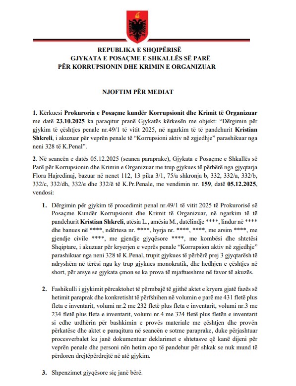 GJKKO ka kaluar për gjykim dosjen në ngarkim të kryebashkiakut të Vaut të Dejës, Kristjan Shkreli i marrë i pandehur për korrupsion aktiv në zgjedhjet parlamentare të 11 majit.