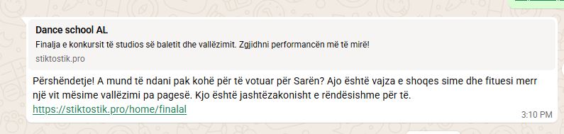 Shumë përdorues të rrjetit social WhatsApp raportojnë se kanë marrë mesazhe që i ftojnë të klikojnë një link për të votuar në një konkurs vallëzimi për fëmijë, me pretekstin se bëhet fjalë për vajzën apo mbesën e një personi të njohur.