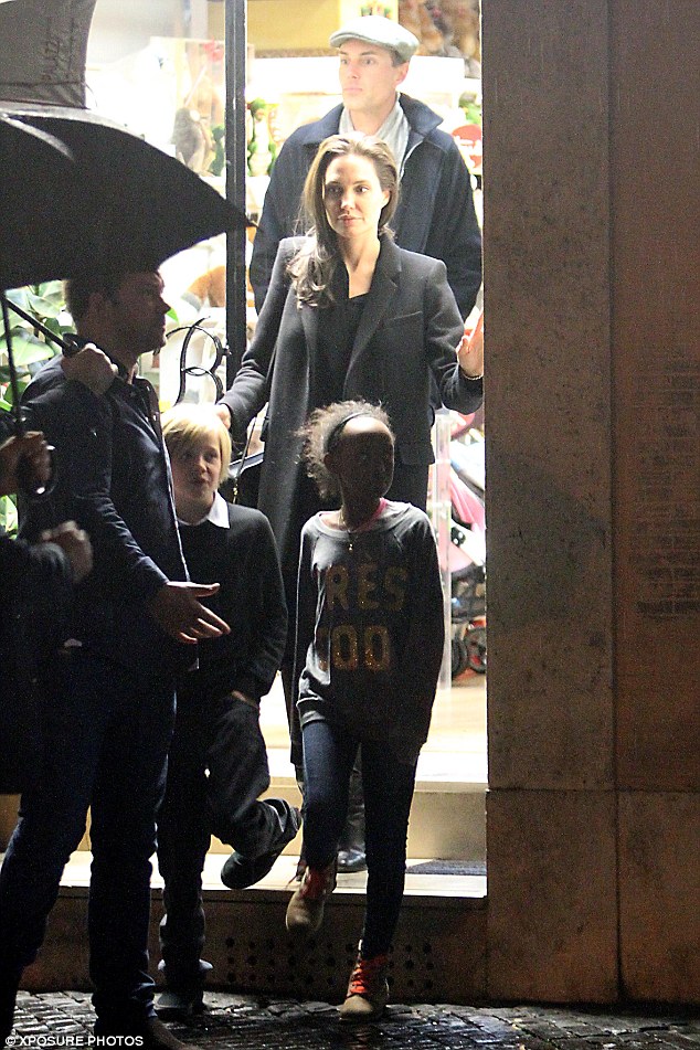 Ajo ka mbërritur ditën e djeshme në aeroportin e Romës së bashku me dy vajzat e saj Shiloh dhe Zahara, por pa bashkëshortin pavarësisht se pritej që të ishte edhe Brad në takim.