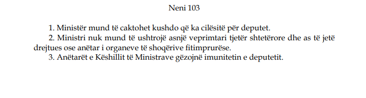 Në fund Këshilli i Ministrave kërkon një interpretim fundor nga ana e Gjykatës Kushtetuese të pikës 3, të nenit 103, të Kushtetutës i cili thotë se “Anëtarët e Këshillit të Ministrave gëzojnë imunitetin e deputetit”.