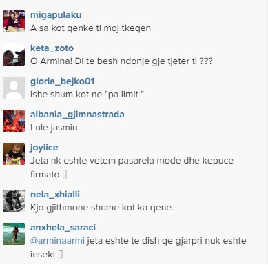 Me vjen te qesh qe njerez qe me ndjekin dhe nuk komentojne kurre,marrin persiper komente vetem kur mendojne se po me ofendojne! calm doën people! As nuk ofendohem dhe as nuk merzitem per komente te kota te njerezve qe nuk me njohin nga afer sepse jane thjeshte "Dust in the Wind"!,”-ka shkruar në Instagram Armina.