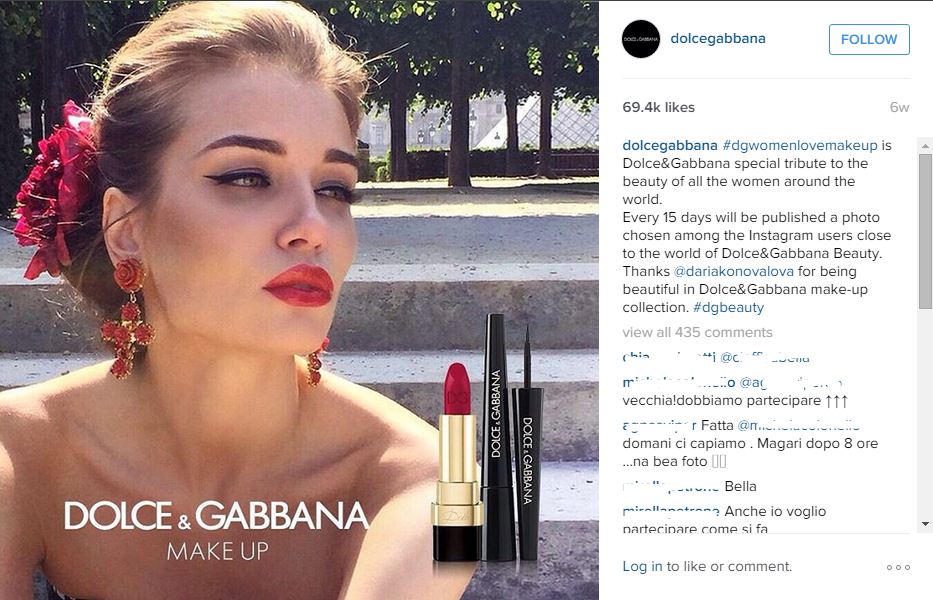 “#dgwomenlovemakeup është atributi special që Dolce&Gabbana i bën femrave të bukura në mbarë botën. Çdo 15 ditë do të publikohet një foto e zgjedhur nga përdorues të Instagramit në mbarë botën, që janë pranë botës së bukurisë Dolce&Gabbana.”- është shpjeguar nisma në faqen zyrtare të markës rreth 6 javë më parë.