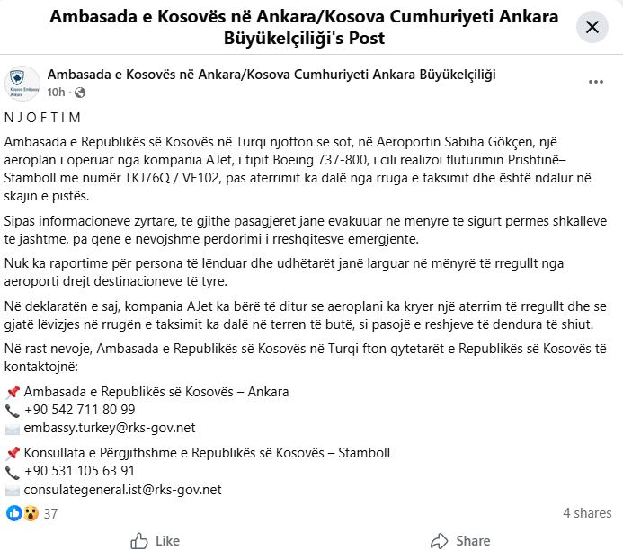 Ambasada e Republikës së Kosovës në Turqi njofton se sot, në Aeroportin Sabiha Gökçen, një aeroplan i operuar nga kompania AJet, i tipit Boeing 737-800, i cili realizoi fluturimin Prishtinë–Stamboll me numër TKJ76Q / VF102, pas aterrimit ka dalë nga rruga e taksimit dhe është ndalur në skajin e pistës.