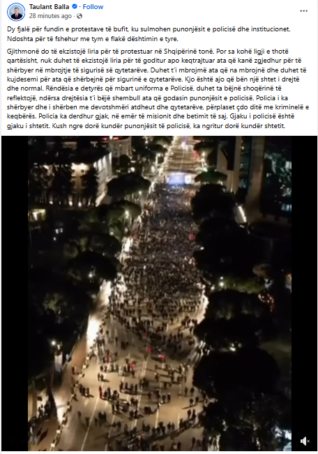“Dy fjalë për fundin e protestave të bufit, ku sulmohen punonjësit e policisë dhe institucionet. Ndoshta për të fshehur me tym e flakë dështimin e tyre. Gjithmonë do të ekzistojë liria për të protestuar në Shqipërinë tonë. Por sa kohë ligji e thotë qartësisht, nuk duhet të ekzistojë liria për të goditur apo keqtrajtuar ata që kanë zgjedhur për të shërbyer në mbrojtje të sigurisë së qytetarëve. Duhet t’i mbrojmë ata që na mbrojnë dhe duhet të kujdesenm për ata që kujdesen për sigurinë e qytetarëve. kjo është ajo që bën një shtet i drejtë dhe normal. Rëndësia e detyrës që mbart uniforma e Policisë, duhet ta bëjnë shoqërinë të reflektojë, ndërsa drejtësia t’i bëjë shembull ata që godasin punonjësit e policisë. Policia i ka shërbyer dhe i shërben me devotshmëri atdheut dhe qytetarëve, përplaset çdo ditë me kriminelë e keqbërës. Policia ka derdhur gjak, në emër të misionit dhe betimit të saj. Gjaku i policisë është gjaku i shtetit. Kush ngre dorë kundër punonjësit të policisë, ka ngritur dorë kundër shtetit” shkruajti Balla në Facebook.