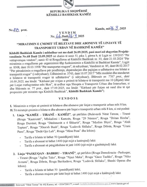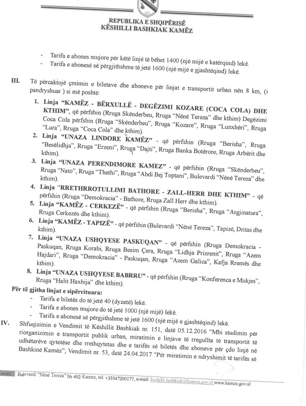 Në vendimin e Këshillit Bashkiak të Kamzës thuhet se kërkesa për rritjen e çmimit të bilës së transportit publik, me 10 lekë, është bëra nga Shoqata për Transportin Urban dhe Interurban.