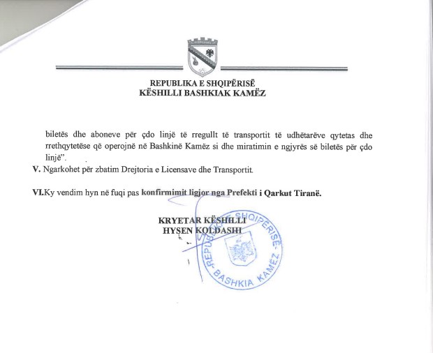 Vendimi është marrë nga Këshilli Bashkiak i Bashkisë Kamëz, me firmën e kryetarit të Këshillit, Hysen Koldashi.