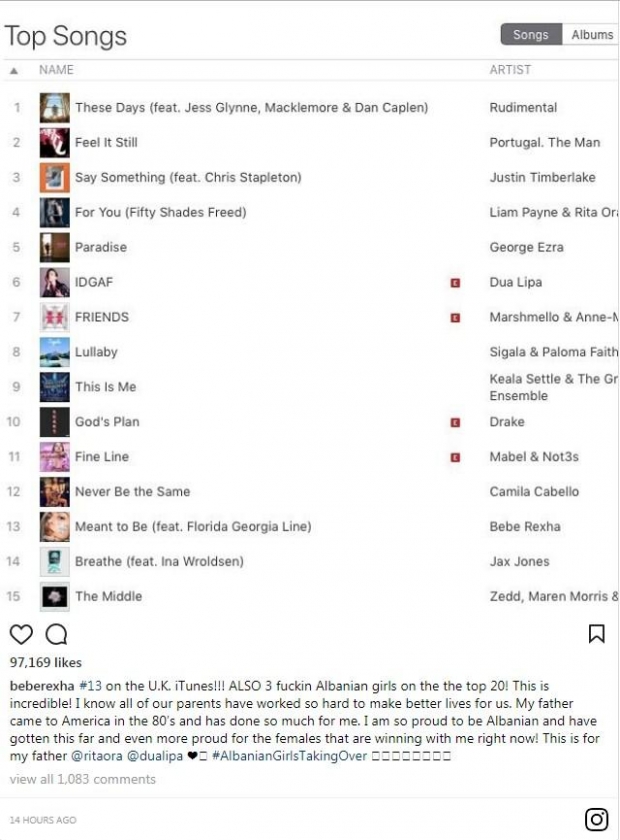 "Jam në vend të 13 në iTunes në Britani. 3 vajza shqiptare janë pjesë gjithashtu. Kjo është e pabesueshme! E di që prindërit tanë kanë punuar fort për të na siguruar një jetë më të mirë. Babai im ka ardhur në Amerikë në vitet ’80 dhe ka bërë shumë për mua. Jam shumë krenare që jam shqiptare dhe që kam arritur kaq larg. Jam akoma më shumë krenare për gratë shqiptare që po korrin sukses bashkë me mua tani! Kjo i dedikohet babait tim”, ka shkruar Bebe Rexha në Instagram.