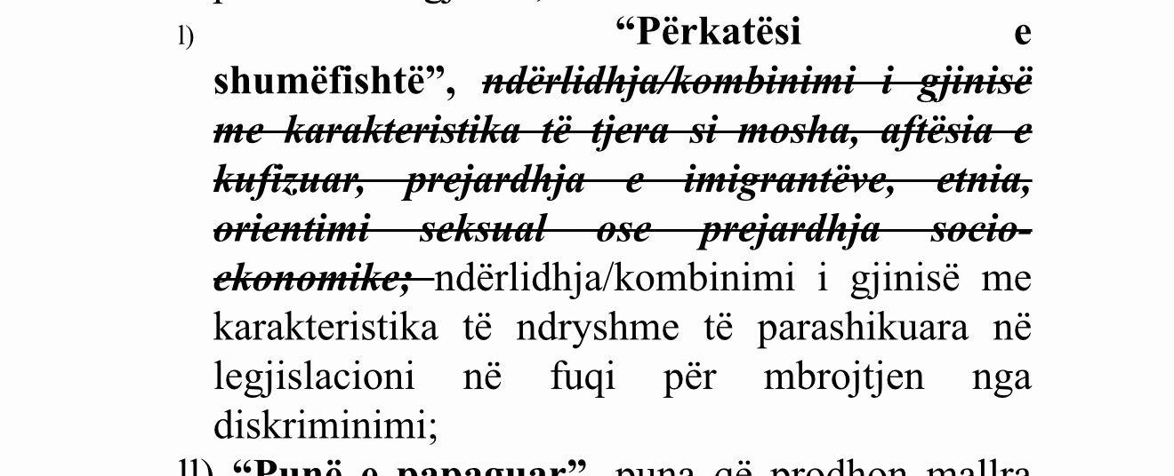 "Përkatësi e shumëfishtë” do të quhet ndërlidhja/kombinimi i gjinisë me karakteristika të ndryshme të parashikuara në legjislacioni në fuqi për mbrojtjen nga diskriminimi.