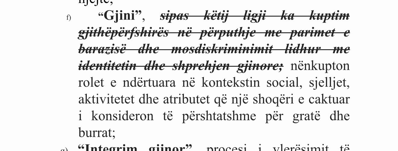 "Gjini" sipas këtij ligji ka kuptim gjithëpërfshirës në përputhje me parimet e barazisë dhe mosdiskriminimit lidhur me identitetin dhe shprehjen gjinore.