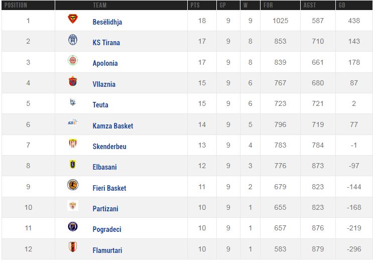 Renditja në elitën e basketbolli shqiptar pas nëntë ndeshjeve të luajtura