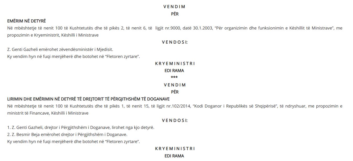 Ndërsa Gent Gazheli pasi drejtoi doganat prej 2020-ës, është emëruar nga qeveria si zëvendës-ministër i Mjedisit.