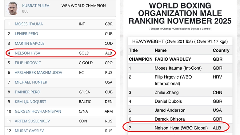 Boksieri shqiptar Nelson Hysa vijon të bëjë përpara në karrierë, pasi për muajin nëntor e gjen veten në pozicionin e shtatë në renditjen botërore për WBO (World Boxing Organization) dhe në pozitën e katërt për kategorinë WBA. Hysa garon për peshat e rënda dhe ia ka dalë që në 24 përballje në ring të fitojë po kaq ndeshje, duke qenë i pamposhtur.
