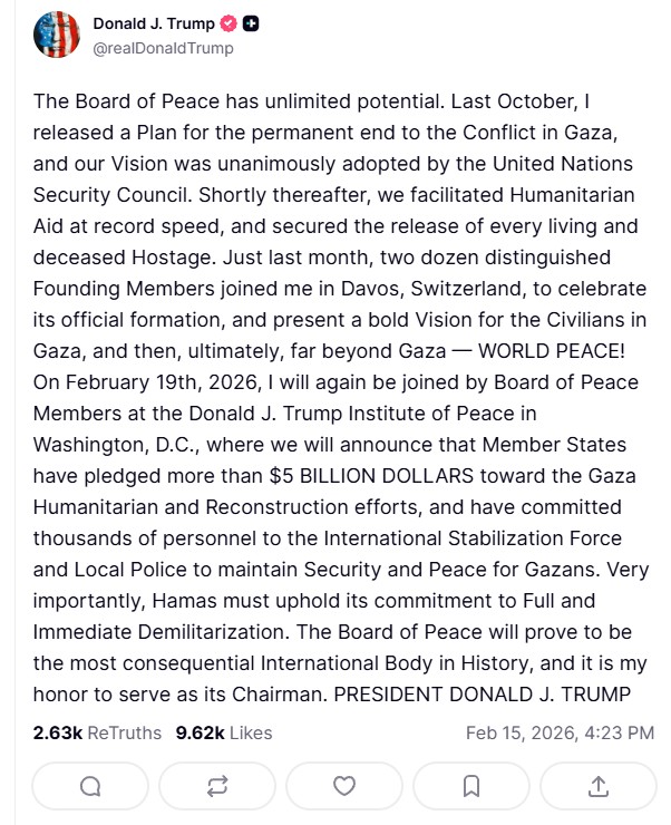 “Bordi i Paqes ka potencial të pakufizuar. Tetorin e kaluar, unë publikova një plan për përfundimin e përhershëm të konfliktit në Gaza, dhe vizioni ynë u miratua unanimisht nga Këshilli i Sigurisë së Kombeve të Bashkuara. Menjëherë pas kësaj, ne lehtësuam ndihmën humanitare me shpejtësi rekord dhe siguruam lirimin e çdo pengu, të gjallë dhe të vdekur. Vetëm muajin e kaluar, dy duzina anëtarësh themeluesish të shquar u bashkuan me mua në Davos, Zvicër, për të festuar formimin e tij zyrtar dhe për të paraqitur një vizion të guximshëm për popullin e Hazës, dhe më pas, përfundimisht, shumë përtej Gazës – paqen në botë! Më 19 shkurt 2026, unë do të bashkohem sërish me anëtarët e Bordit të Paqes në Institutin e Paqes Donald J. Trump Institute of Peace në Uashington, D.C., ku do të njoftojmë se shtetet anëtare kanë premtuar më shumë se 5 miliardë dollarë për përpjekjet humanitare dhe rindërtimit në Gaza, dhe janë angazhuar me mijëra personel në forcën ndërkombëtare të stabilizimit dhe policinë lokale për të ruajtur sigurinë dhe paqen për banorët e Gazës”, shkruan Trump.