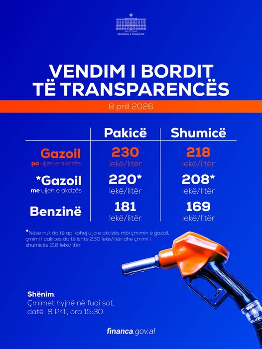 Duke aplikuar dhe uljen e akcizës, Bordi i Transparencës ka vendosur uljen e çmimit të naftës nga 224 lekë/litër, në 220 lekë për litër. Pa uljen 20% të akcizës, çmimi i caktuar nga Bordi për naftën do të ishte sot 230 lekë/litër.