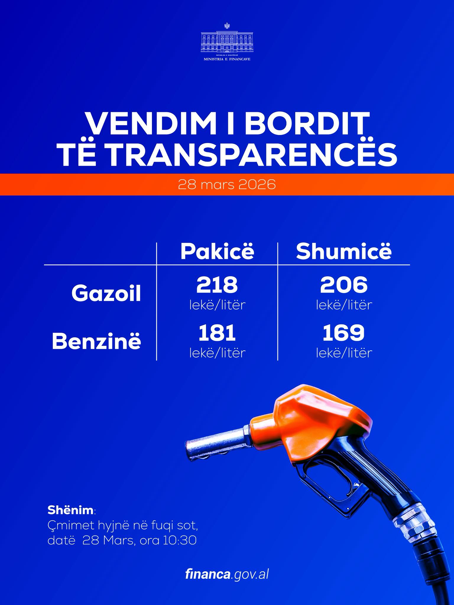 Në mbledhjen e parë të zhvilluar më 26 mars, Bordi i Transparencës vendosi të ulë çmimet. Nga 214 lekë për litër, një çmim që qëndroi për gati 1 javë, u ul në nivelin e 203 lekë për litër. Ndërsa benzina nga 199 lekë për litër u ul në 175 lekë për litër, por me vendimmarrjen e re të Bordit të Transparencës tashmë çmimet rriten.