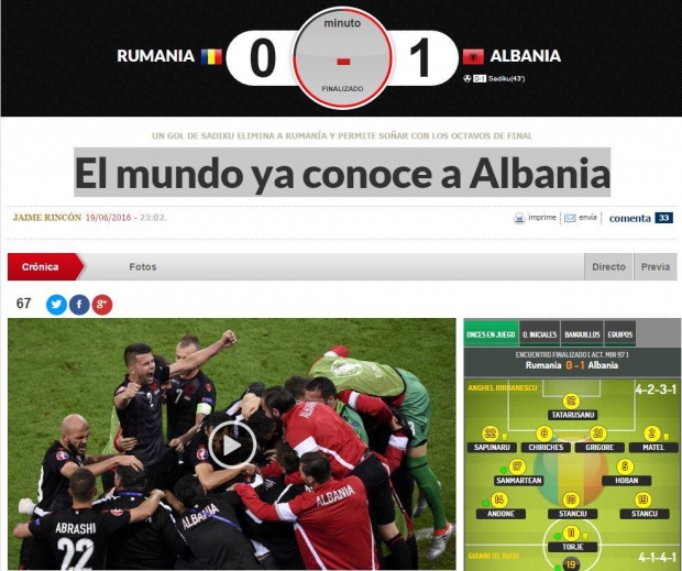 Titujt e mediave botërore kanë lartësuar paraqitjen e Shqipërisë, teksa më i godituri vjen nga Spanja, aty ku gazeta më e madhe sportive ‘Marca’ shkruan se “Bota njeh Shqipërinë” ndërsa spanjollja tjetër ‘AS’ e vendos theksin te shpresa e kuqezinjve për në raundin tjetër.