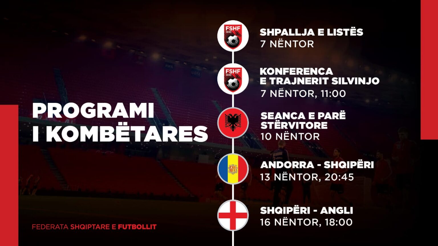 Ndeshja Andorra - Shqipëri do të luhet më 13 nëntor, në “Estadi FAF Encamp”, në orën 20:45. Sfida e fundit e kuqezinjve në këto kualifikuese do të zhvillohet më 16 nëntor, në stadiumin “Air Albania”, ndaj Anglisë, në orën 18:00.