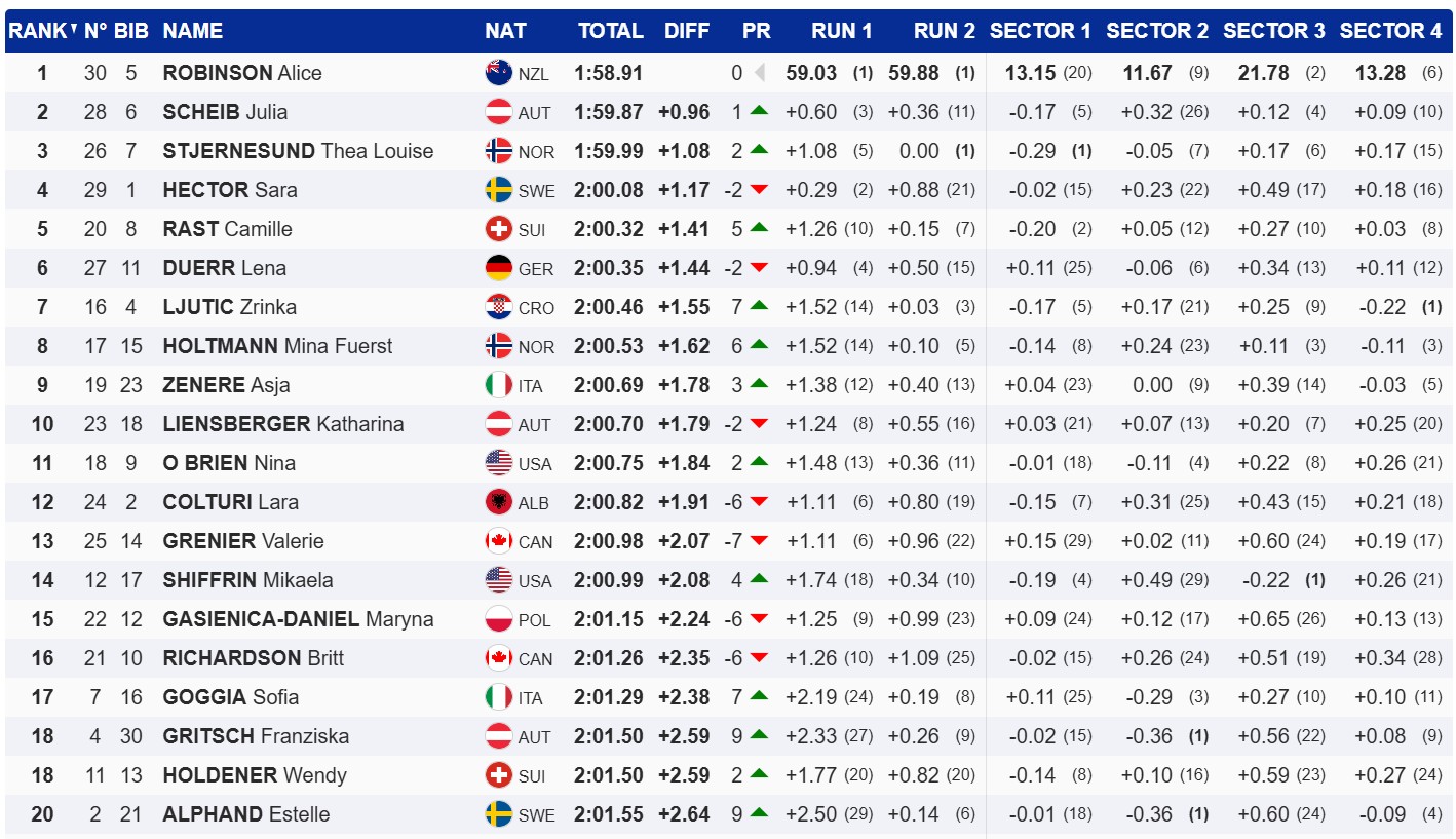 Kjo garë u fitua nga Alice Robinson me kohën 1 minutë, 58 sekonda e 91 të qindtat, ndërsa në podium edhe austriakja Julia Scheib dhe norvegjezja Thea Louise Stjernesund.