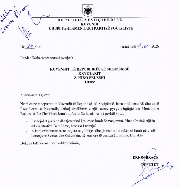 Në kërkesën drejtuar Kryetarit të Kuvendit, Niko Peleshi, deputeti Braçe kërkon shpjegime se përse është lejuar grabitja dhe tjetërsimiti i tokës së lumit Seman, pranë fshatit Imshtë.