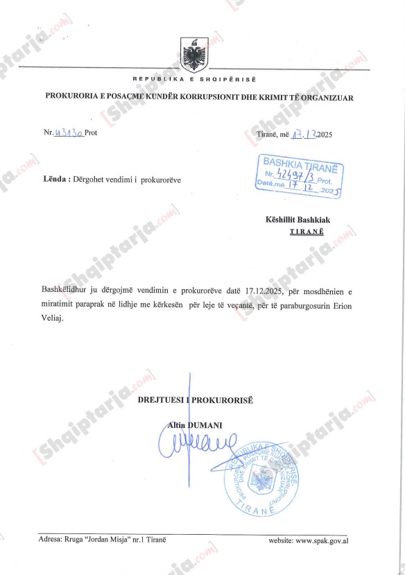 Ne Altin Dumani dhe Ols Dado, Prokurorë në Prokurorinë e Posaçme kundër Korrupsionit dhe Krimit të Organizuar, pasi u njohëm me kërkesën e nënshkruar nga Sekretari i Këshillit Bashkiak Tiranë, me nr. Prot. 42497/2 datë 16.12.2025,