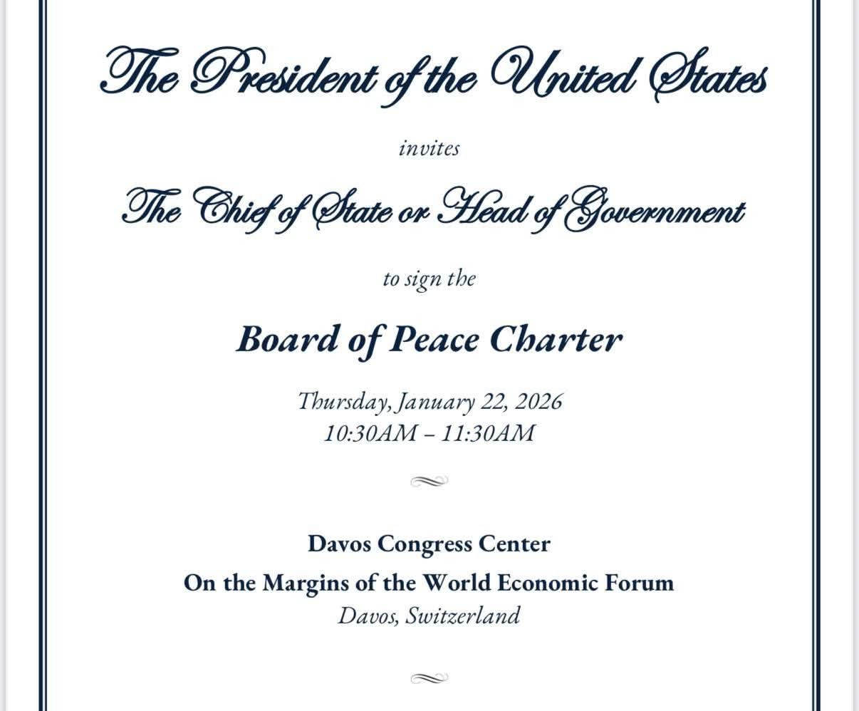 Ceremonia e nënshkrimit të Bordit të Paqes do të mbahet në Davos më 22 janar. Gazetari izraelit Barak Ravid, ka shpërndarë në rrjetet sociale ftesën e presidentit të SHBA-ve, Donald Trump, kundrejt liderëve të vendeve të ftuara.