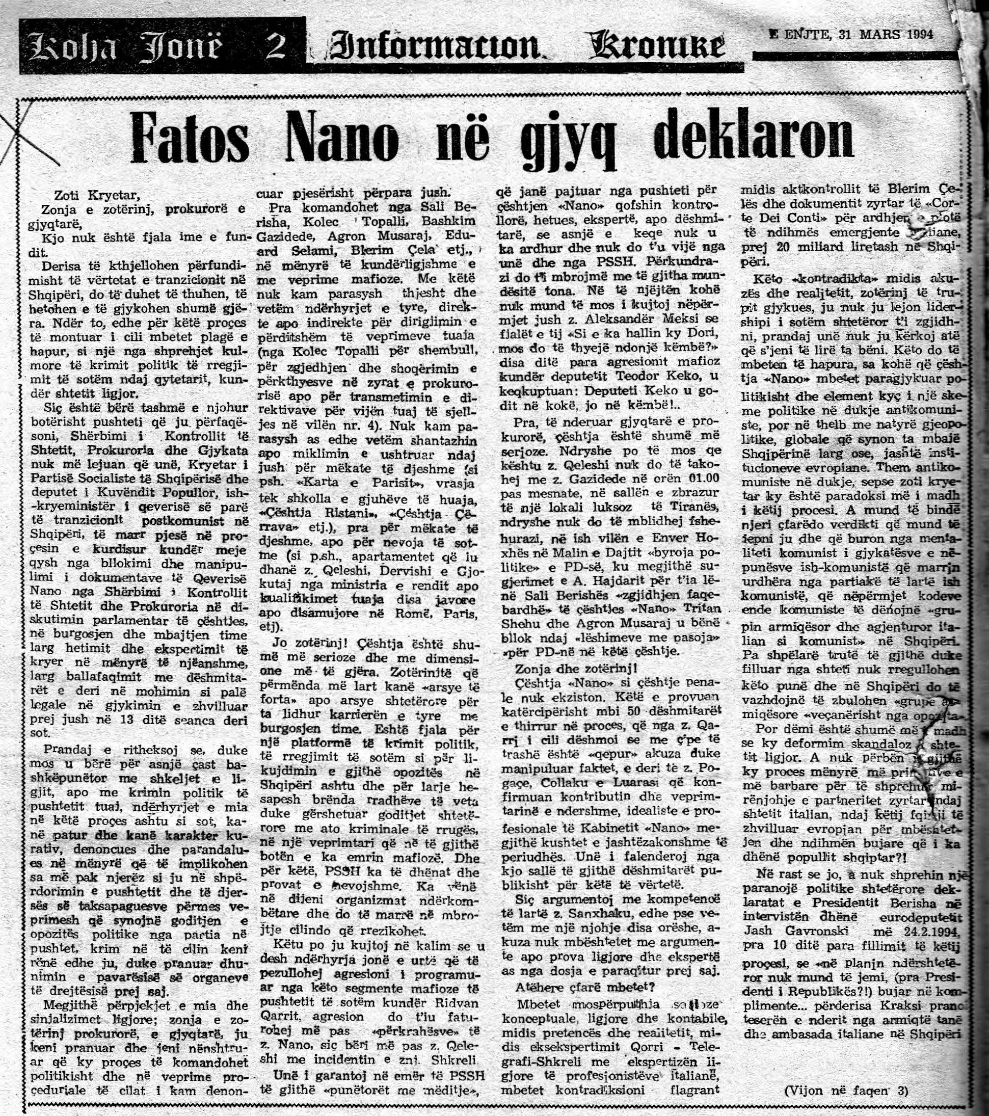 “Fatos Nano në gjyq deklaron”, është titulli “bombë” i gazetës “Koha Jonë”, e enjte, 31 mars 1994. Në faqen 2-3 të këtij numri të gazetës publikohet e plotë fjala e Ish-Kryeministrit dhe Ish-Kreut të PSSH, Fatos Nano, mbajtur në sallën e gjyqit kundër tij.