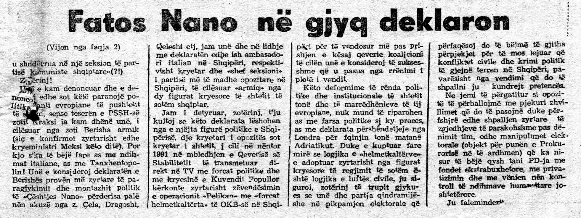 Unë e kam denoncuar dhe e denoncoi edhe sot këtë paranojë politike antievropiane të pushtetit të sotëm, sepse teserën e PSSH-së zotit Kraksi ia kam dhënë unë, i cilësuar nga zoti Berisha armik (siç e konfirmoi zyrtarisht edhe kryeministri Meksi këto ditë). Por kjo s’ka të bëjë fare as me ndihmat italiane, as me Tanxhentopolin! Unë e konsideroj deklaratën e Berishës provën më zyrtare të paragjykimit dhe montazhit politik të Çështjes Nano përderisa palë nën akuzë nga z. Çela, Dragoshi,