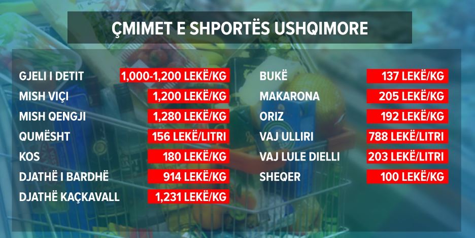 Shtrenjtimi i ushqimeve po u kushton shumë familjeve shqiptare të cilat shpenzojnë afro 40% të të ardhurave të tyre për bukë, perime, produkte mishi e bulmet. Për të blerë produktet bazë të shportës, një familje shqiptare me mesatarisht 3.1 anëtarë, duhet të shpenzojë të paktën 36,879 lekë në muaj, gati 3 herë më shumë se mesatarja e Bashkimit Evropian.