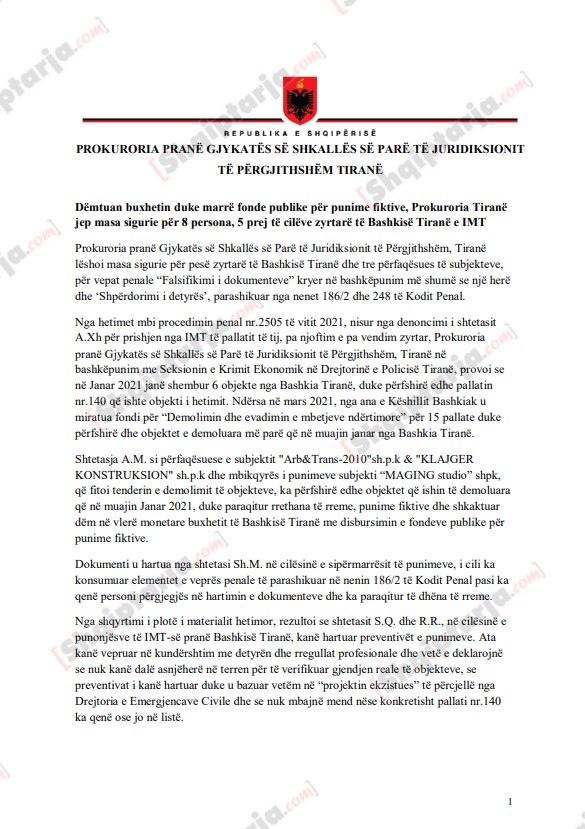 Prokuroria pranë Gjykatës së Shkallës së Parë të Juridiksionit të Përgjithshëm, Tiranë lëshoi masa sigurie për pesë zyrtarë të Bashkisë Tiranë dhe tre përfaqësues të subjekteve, për vepat penale “Falsifikimi i dokumenteve” kryer në bashkëpunim më shumë se një herë dhe ‘Shpërdorimi i detyrës’.