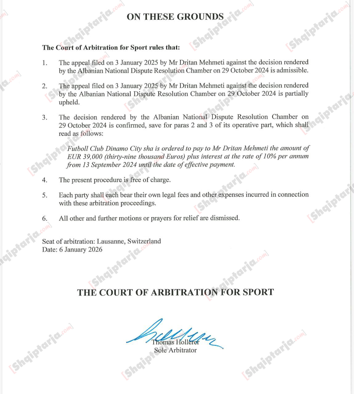 Megjithatë Mehmeti nuk e la me kaq, por e dërgoi çështjen në CAS. Kjo e fundit e ka dënuar Dinamon për ndërprerjen e kontratës me 39 mijë euro plus 10% për shkak të vonesave. Kjo shumë duhet të paguhet në harkun kohor të 2 javëve pasi Dinamo rrezikon të tjera dënime. Për Report TV Mehmeti tha se e ndoqi çështjen deri në fund për çështje vlerësimi të punës së tij dhe jo parash.