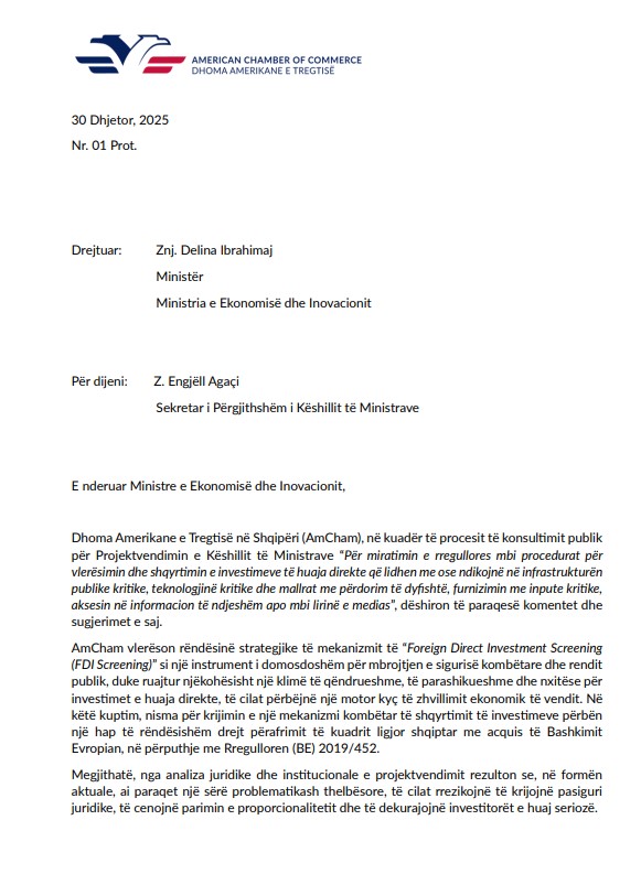 Dhoma Amerikane e Tregtisë i ka dërguar një letër Ministres së Ekonomisë dhe Inovacionit, për dijeni sekretarit të përgjithshëm të Këshillit të Ministrave, duke i shprehur disa shqetësime në lidhje me Projektvendimin e Këshillit të Ministrave “Për miratimin e rregullores mbi procedurat për vlerësimin dhe shqyrtimin e investimeve të huaja direkte që lidhen me ose ndikojnë në infrastrukturën publike kritike, teknologjinë kritike dhe mallrat me përdorim të dyfishtë, furnizimin me inpute kritike, aksesin në informacion të ndjeshëm apo mbi lirinë e medias”.