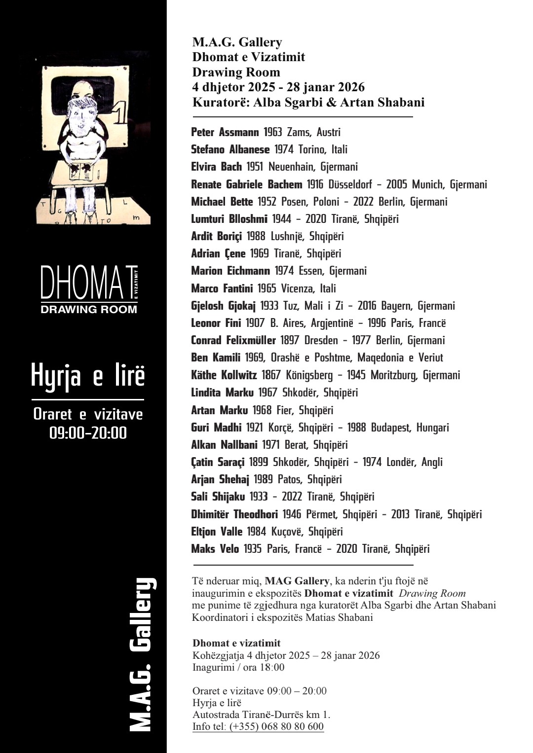 “Dhomat e vizatimit” përfshin pothuajse dy shekuj krijimtarie të artistëve shqiptarë në grafikë, vizatime, pastel etj. dhe sjell në një prezantim të përbashkët teknika dhe tradita të ndryshme të artit shqiptar. Ajo do të qëndrojë e çelur në galerinë MAG deri më 28 janar 2026.
