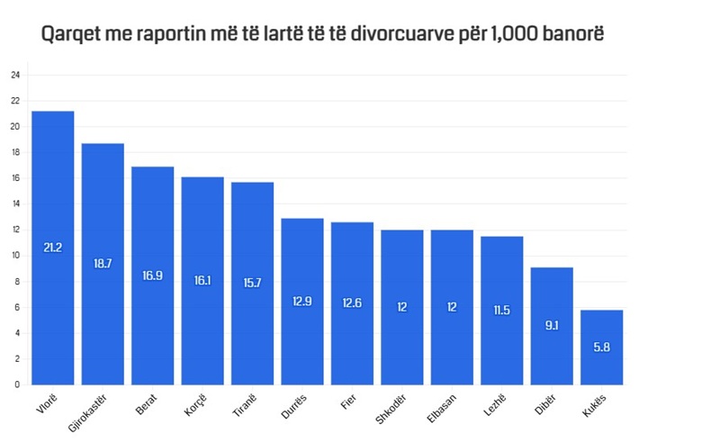 Këto shifra krijojnë një ndarje të qartë mes qarqeve. Nga njëra anë janë qarqe si Vlora, Gjirokastra, Berati dhe Korça, ku pesha e të divorcuarve del dukshëm më e lartë. Nga ana tjetër janë qarqe si Kukësi dhe Dibra, ku divorci, të paktën sipas statusit civil të regjistruar në census, shfaqet shumë më i kufizuar në raport me popullsinë.