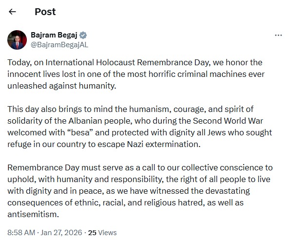 ”Dita e Kujtesës duhet të shërbejë si një thirrje e ndërgjegjes kolektive për të mbrojtur me humanizëm dhe përgjegjësi të drejtën e të gjithëve për të jetuar me dinjitet dhe në paqe, sepse të gjithë i kemi parë pasojat e tmerrshme të urrejtjes etnike, racore, fetare dhe të antisemitizmit”, shprehet Begaj