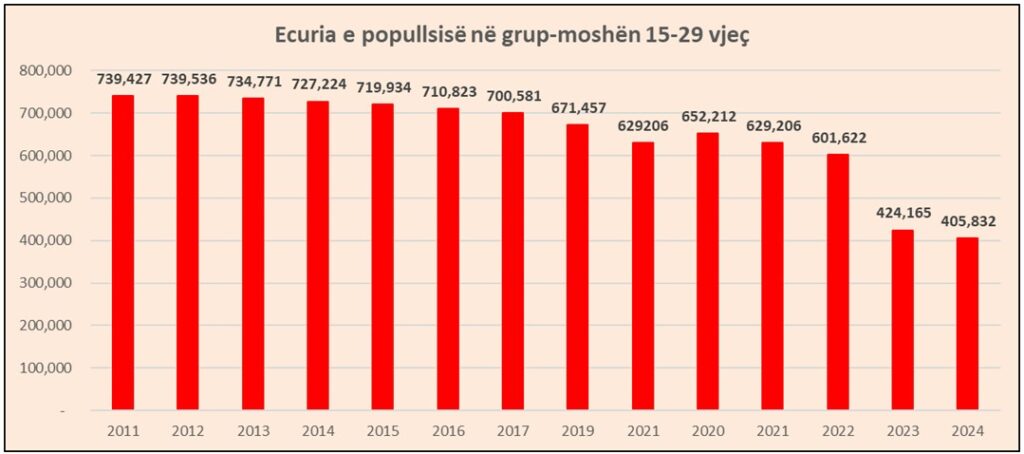 Të dhënat e INSTAT tregojnë se në vitin 2024 në të gjithë vendin kishte vetëm 405 mijë të rinj të moshës 15–29 vjeç, ose 45 për qind më pak se në censin e vitit 2011.