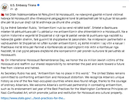 “Siç ka thënë Sekretari Rubio, “Antisemitizmi nuk ka vend në këtë botë”. Shtetet e Bashkuara mbeten të përkushtuara për t’u përballur me antisemitizmin dhe shtrembërimin e Holokaustit. Ne e njohim historinë e veçantë të Shqipërisë si një nga të paktat vende të pushtuara nga nazistët ku hebrenjtë gjetën strehim, falë guximit të shqiptarëve të zakonshëm. Ne mirëpresim partneritetin e vazhdueshëm të Shqipërisë në luftën kundër antisemitizmit, siç është miratimi i saj vitin e kaluar i Praktikave më të Mira për Parimet e Konferencës së Uashingtonit mbi Artin e Konfiskuar nga Nazistët, të cilat çojnë përpara drejtësinë dhe kompensimin për pronën kulturore të periudhës së Holokaustit” shkruhet në postimin e Ambasadës në Facebook.