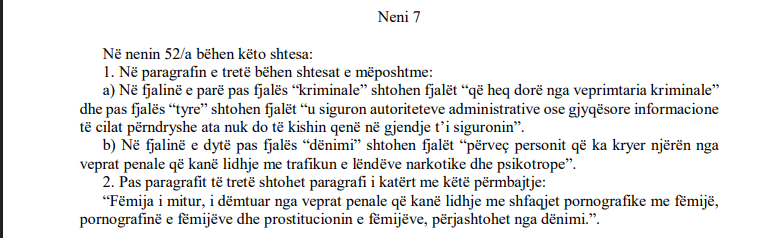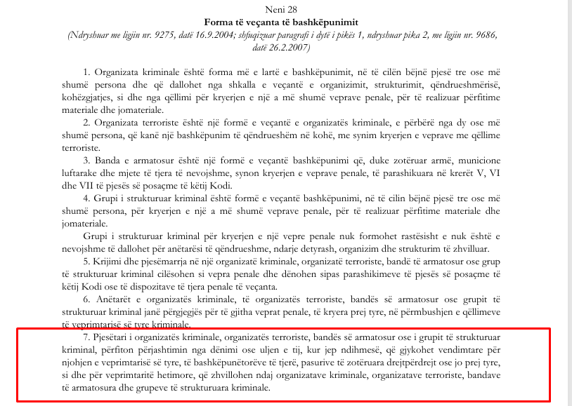U shfuqizua paragrafi i 7-të i nenit 28 të Kodit Penal që citonte se “Pjesëtari i organizatës kriminale, organizatës terroriste, bandës së armatosur ose i grupit të strukturuar  kriminal, përfiton përjashtimin nga dënimi ose uljen e tij, kur jep ndihmesë, që gjykohet vendimtare për  njohjen e veprimtarisë së tyre, të bashkëpunëtorëve të tjerë, pasurive të zotëruara drejtpërdrejt ose jo prej tyre,  si dhe për veprimtaritë hetimore, që zhvillohen ndaj organizatave kriminale, organizatave terroriste, bandave  të armatosura dhe grupeve të strukturuara kriminale”.