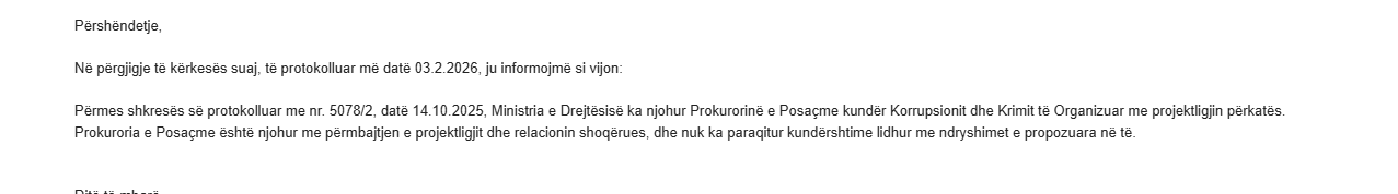 Por ndryshe mendon Prokuroria e Përgjithshme. Ombrella e organit të akuzës së juridiksionit të përgjithshëm thotë se në përgjigjen për Report Tv se gjatë gjatë procesit të konsultimit, është shprehur kundër shfuqizimit të paragrafit të shtatë të nenit 28 të Kodit Penal