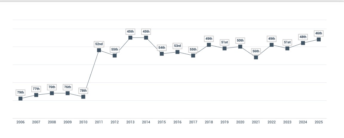 Grafiku tregon një rritje graduale të fuqisë së pasaportës shqiptare, nga vendi i 79-të në vitin 2006 në vendin e 46-të në vitin 2025, me luhatje të vogla ndër vite, por me trend të qartë pozitiv.