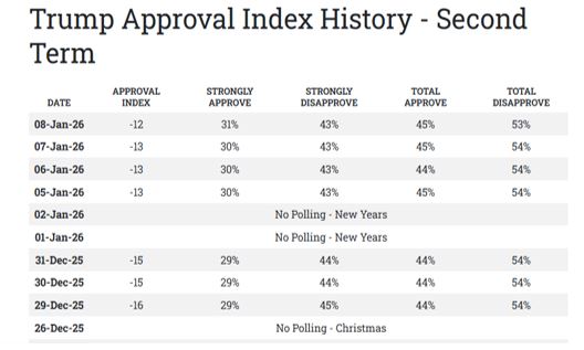 Nga sondazhi i publikuar sot prej Rasmussen, rezulton se vetëm 45% e atyre që votuan në zgjedhjet e fundit presidenciale kanë vlerësim pozitv për punën e Presidentit Trump. Nga këta, vetëm 31% kanë vlerësim shumë pozitiv (shihni tabelën e mëposhtme).