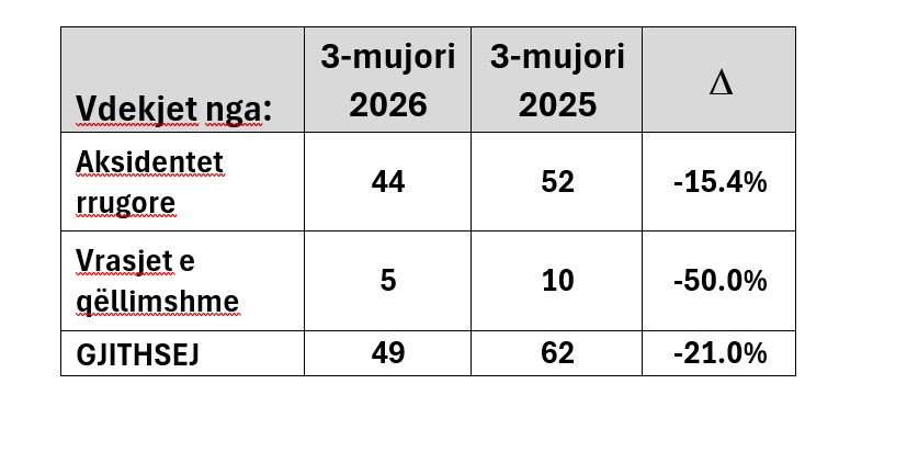 Siç ilustrohet në tabelën e mëposhtme, vdekjet rrugore dhe nga krimi kanë shënuar një reduktim drastik në krahasim me tremujorin e parë të vitit të shkuar: 15.4% janë reduktuar vdekjet rrugore dhe 50% vdekjet nga krimi – në total janë reduktuar 21%.