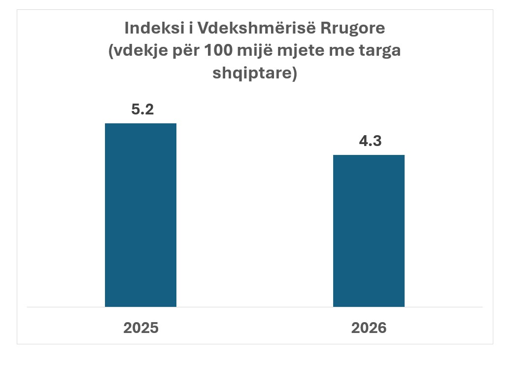 Po të llogarisim indeksin e vdekshmërisë rrugore (vdekje rrugore për 100 mijë automjete me targa shqiptare), rezulton se vdekshmëria rrugore është ulur me pothuaj 1/5 brenda një viti (shihni grafikun e mëposhtëm).