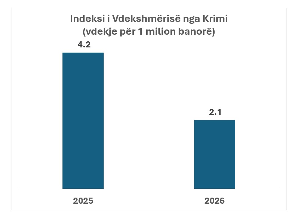 Vdekshmëria nga krimi është përgjysmuar, krahasuar me 2025. Shihni grafikun e mëposhtëm për indeksin e vdekshmërisë nga krimi (vdekje nga krimi për 1 milion banorë).
