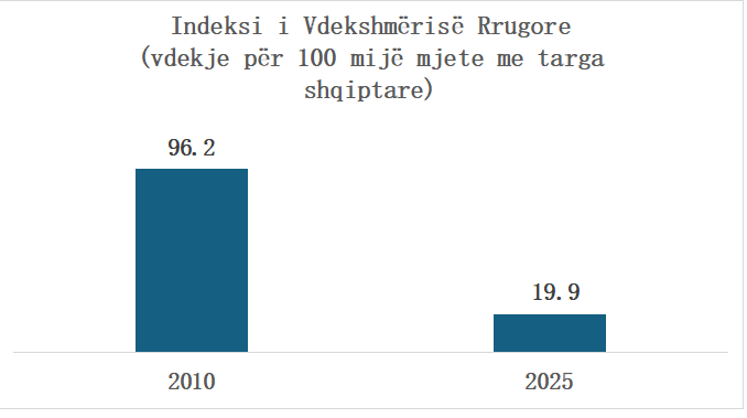 Po të llogarisim indeksin e vdekshmërisë rrugore (vdekje rrugore për 100 mijë automjete me targa shqiptare), rezulton se vdekshmëria rrugore ka qenë pothuaj pesëfish më e lartë më 2010, krahasuar me 2025 (shihni grafikun e mëposhtëm).