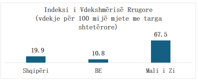 Në qoftë se vdekjet e këmbësorëve/biçiklistëve/motoçiklistëve (që përbëjnë aktualisht 57% të gjithë vdekjeve rrugore këtu) do të ishin të krahasueshme në përqindje me BE-në (20%), ne do ta kishim sot indeksin e vdekshmërisë rrugore të barabartë me mesataren europiane! Ndërkohë, vdekshmëria rrugore në Shqipëri është shumë më e ulët se në Malin e Zi (shihni grafikun e mëposhtëm).